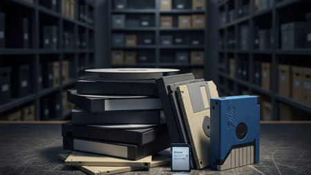 Close-up, background depicting elements of the 1990s. Colored cardboard creating triangular shapes and electronic storage devices, floppy disks, VHS tapes, cassettes and CDs.
