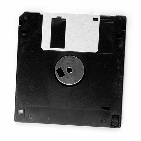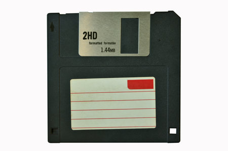 Old computer and data storage technology, black plastic magnetic floppy disk 3½ inches, isolated on white background
