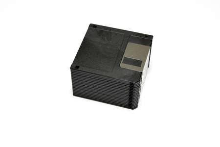 Whole plane with white background of stack of colored floppy disks, grey, black and blue.