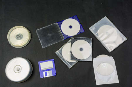 Mini CDs stacked on floppy disks, objects isolated on a white background, the evolution of technology.