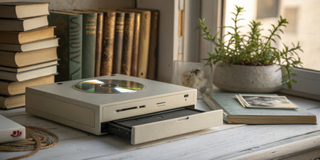 A serene workspace where a vintage towers CDROM drive is in the midst of opening the light reflecting subtly off the tray framed by faded books and a delicate potted plant..
