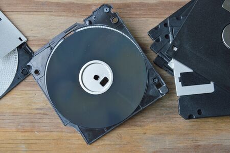 Floppy Disks Drive Set on the Yellow Paper Background closeup