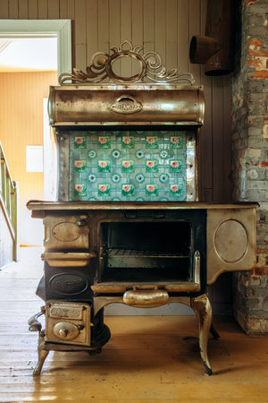 Chambord, Canada - August 18, 2025: Restored vintage Belanger stove in preserved 1927 house interior at Val-Jalbert Historical Village in Quebec
