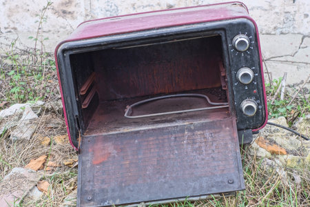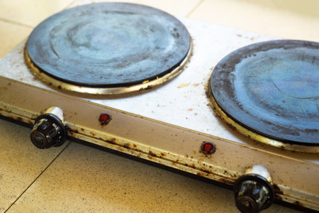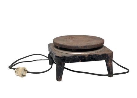 An old rusty electric stove on the table. Unsanitary cooking conditions. Old household appliances.