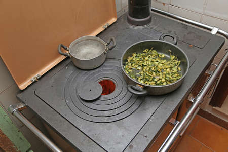 pan with zucchini baked in cast iron stove with fire lit in the old mountain home
