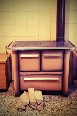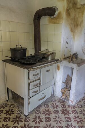 ancient wood stove in a kitchenette of an old mountain house