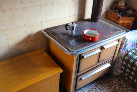 ancient wood stove of an economical kitchen with the moka for preparing coffee at home on the hot cast iron plate