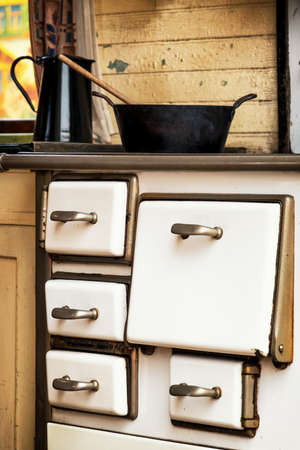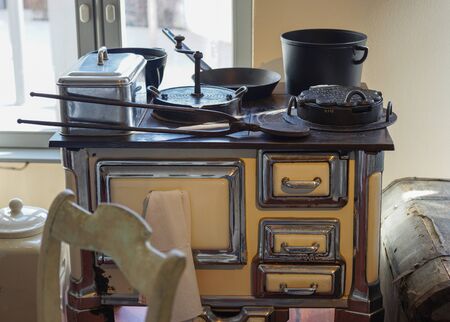 Old kitchen stove with cooking and baking utensils