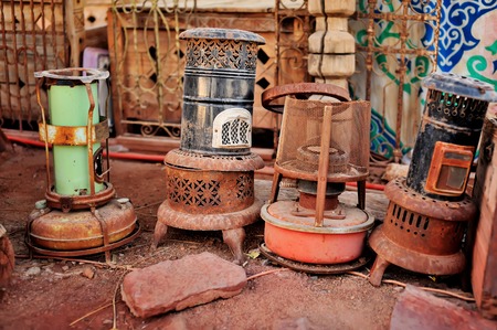 An old broken rusted burner of a gas stove.