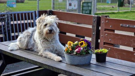 A cute dog, resting on a wooden table, next to a floral arrangement.