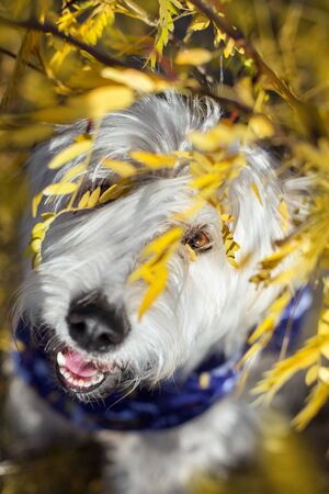 Smiling Dog. Tibetan terrier dog standing in the forest with a bunch of fallen leaves surrounding him. Selective focus, copy space