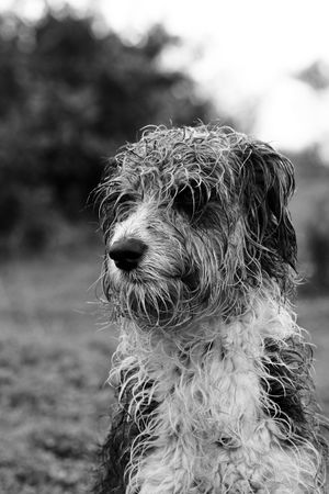 Closeup view of a head and neck of a domestic dog with his fur wet.
