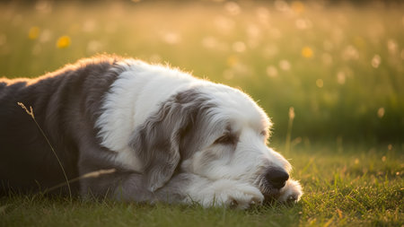 Lying and relaxing dog border collie on a spring grassy meadow at sunset
