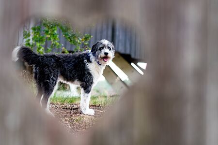 A black and white bordercollie dog seen through a heart shaped hole in a wooden door