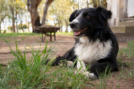 CLOSE-UP OF A BORDER COLLIE DOG SITTING ON THE LAWN, ON A SUNNY DAY