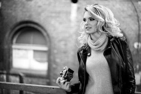 fashion outdoor photo of beautiful sensual woman with dark hair in elegant dress and accessories posing in old city