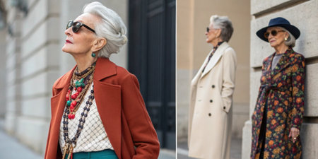 A collection showcasing women's vintage fashion with elegant coats, dresses, and stylish hats in vibrant colors, highlighting classic style and timeless fashion trends.