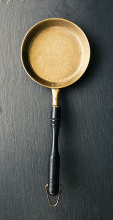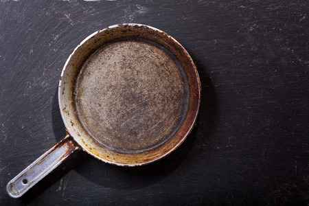 Culinary background with empty old pan on a dark slate, stone, concrete or metal background. Top view with copy space.