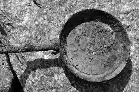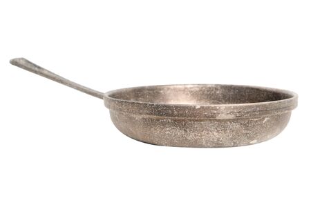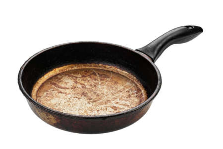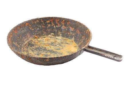 old disgusting stained rusty cast iron pan with burnt fat and food leftovers isolated