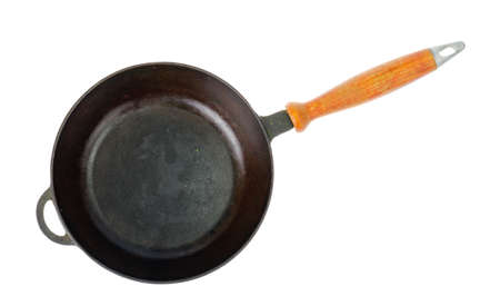 Cast iron black pan with wooden brown handle isolated on white background. Studio Photo