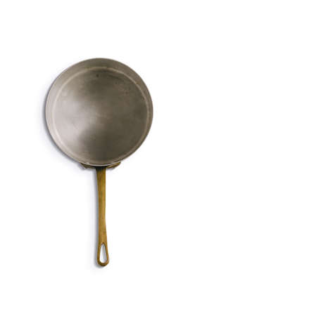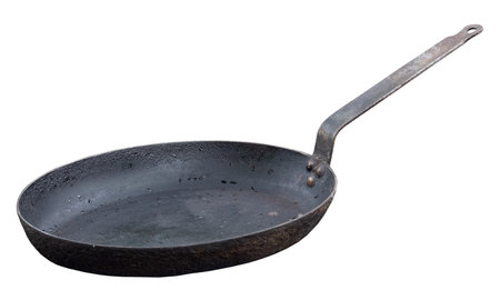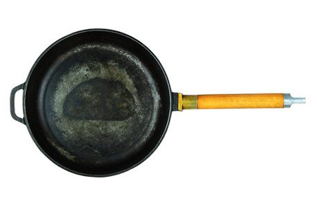 Cast iron pan. Pan was used. Cookware isolated on white background. Top view.