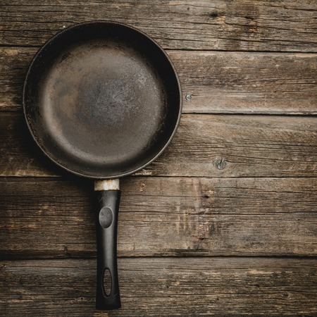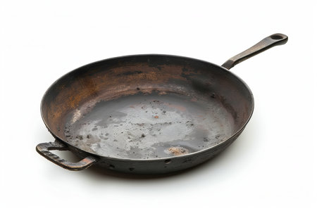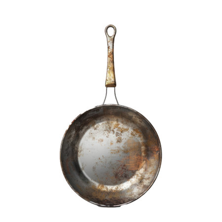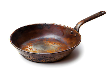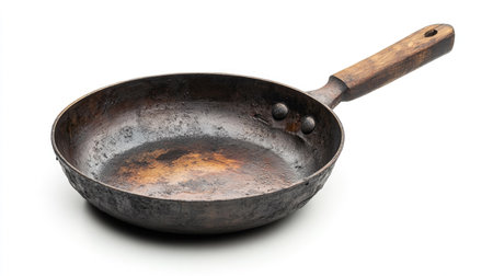 A vintage frying pan featuring signs of wear and tarnish, perfect for showcasing rustic charm. Ideal for culinary-themed projects or kitchen decor designs.