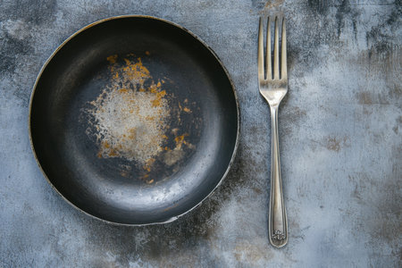A slightly tarnished black plate shows signs of wear with a few marks on its surface resting next to a polished silver fork. The forks design features delicate detailing on the handle contrasting with the rustic look of the plate