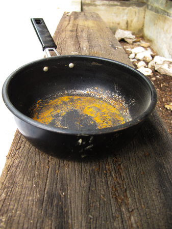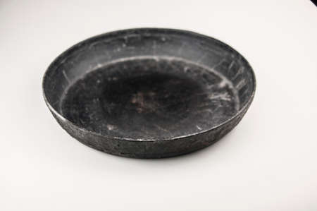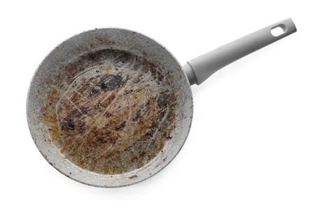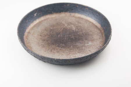 old stained aluminium pan with burnt fat and peeled off TFE non-stick coating and burnt fat isolated