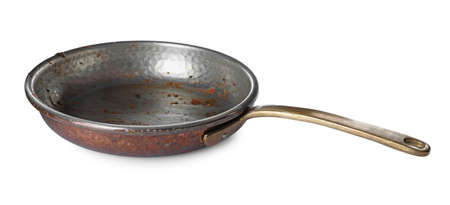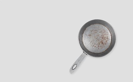 Dirty old frying pan. Isolated on white background. File contains clipping path. Top view.