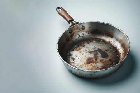 This image features a rusty and worn cooking pan resting on a stove surface, showcasing years of use with distinctive stains and scratches, perfect for illustrating kitchen wear.