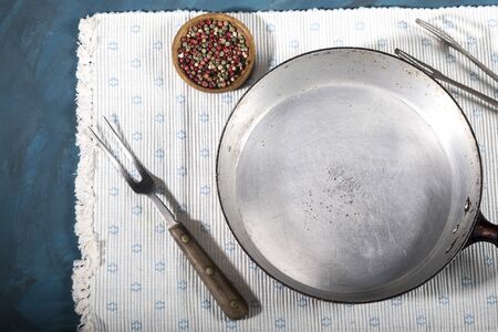 background, black, close-up, cook, cooking, background, dark, lunch, dish, equipment, fry ,gray, isolated, menu, metal, object, rustic ,shallow pan ,Silver, tableware, empty, shiny, cooking, table, recipe, food, pen, fork,Cutlery, dinner, vintage, top view