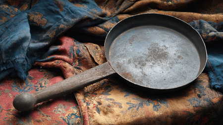 This image features an antique cast iron pan set beautifully against richly textured fabric. The arrangement highlights the rustic charm and timeless appeal of vintage kitchenware.