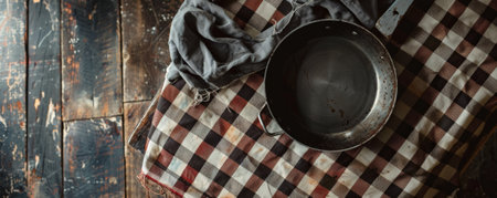 An overhead shot of a wooden table with a checkered tablecloth and an old, worn-out pan. The arrangement evokes a sense of nostalgia and homeliness.