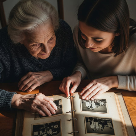 Elderly woman gazes at vintage photos, reflecting on memories and the challenges of dementia