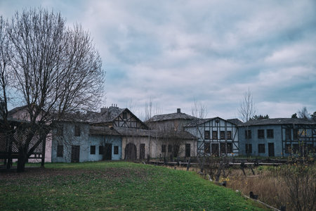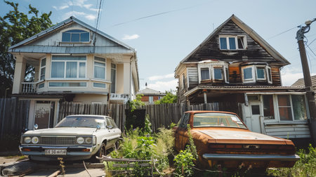 An inviting view features two houses framed by a wooden foreground. The image displays a daylight scene with warm tones and textured wooden elements. The composition suggests an inviting atmosphere. Suitable for a range of creative projects, this image could be used for websites, brochures, or editorial content.