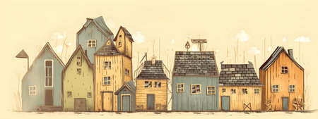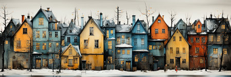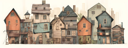 Illustration of old, colorful, wooden houses in a row with a cityscape background, AI generated