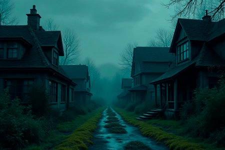 A remote village trail stretches through an abandoned area lined with old houses, surrounded by misty mountains and overgrown grass, evoking a sense of nostalgia and tranquility.