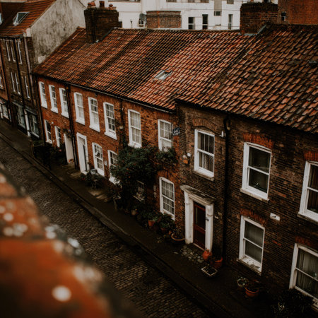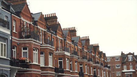 Close-up of Row of typical English terraced brick houses against the grey sky in autumn day. Action. Traditional English architecture
