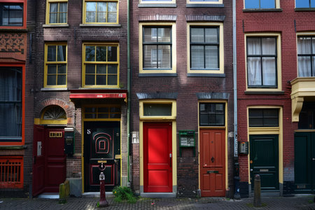 Row of colorful brick buildings showing unique doors in amsterdam, netherlands