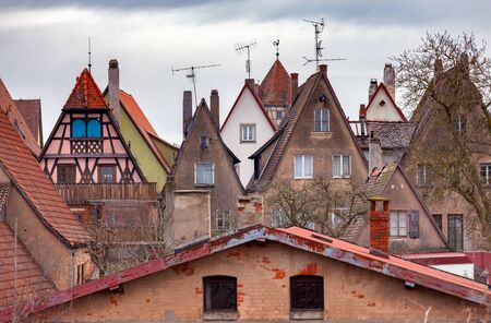 Red rooftops shot from drone, old houses in the summer afternoon light