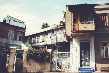 Old Tbilisi architecture, windows and balcony exterior decor in summer day.