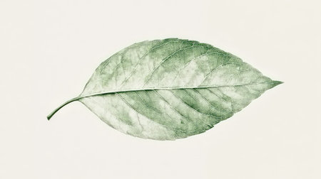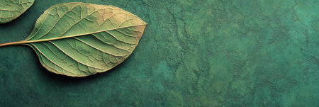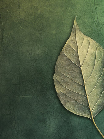 A prominent leaf with intricate details sits on a textured green backdrop, creating a serene atmosphere ideal for organic and sustainable themes.