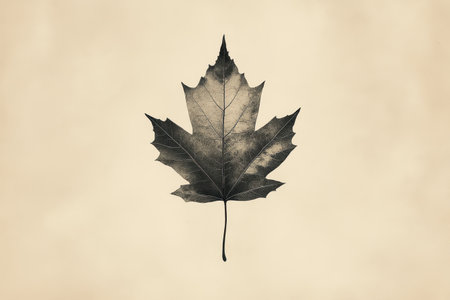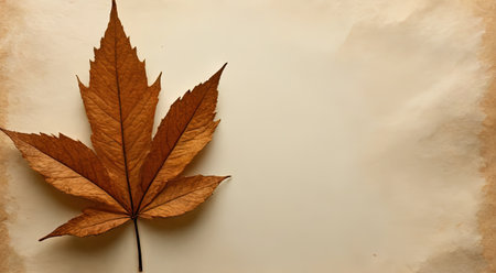 A beautifully preserved brown maple leaf rests on a blank vintage paper background, evoking autumn vibes. Ideal for nature-themed artwork or decor.