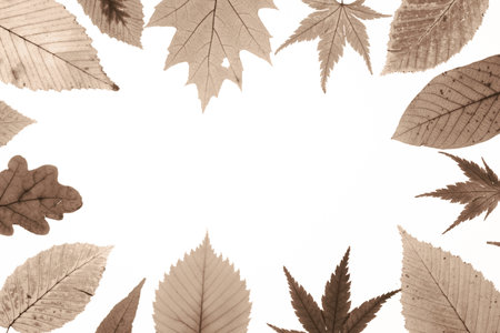 Colorful autumn leaves arranged on a white background creating a beautiful display of fall colors, showcasing the transition of seasons from summer to winter