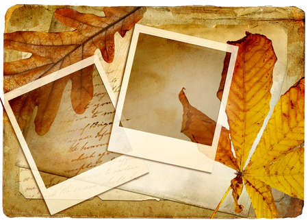 Vintage photo album book laying in fallen autumn leaves and retro photos of peoples with no faces on crumpled paper page surface background. Photo album background mockup design.