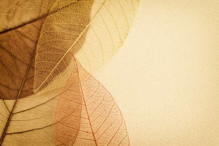 A simple autumn-inspired design with layered, translucent leaves in shades of rust, ochre, and golden yellow, floating on a textured beige background.