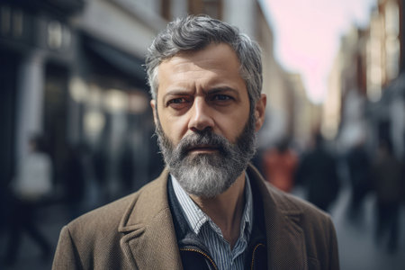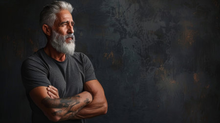 Serious middle-aged man with folded arms and a deadpan expression posing in front of a background Model portrait illustration. Generative AI art