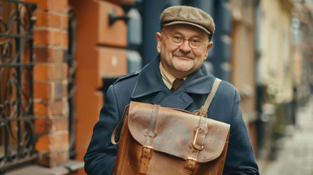An elderly man with a leather bag smiles warmly in a charming street, embodying nostalgia and timeless style.