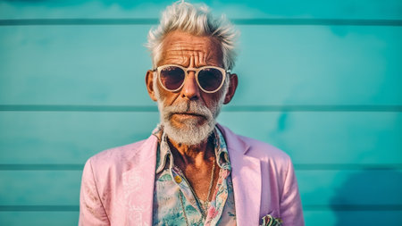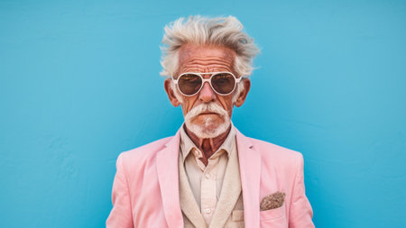 an older man exuding cool confidence in his sunglasses against a vibrant pastel background. This compelling image captures the essence of timeless style and the joy of warm-weather moments