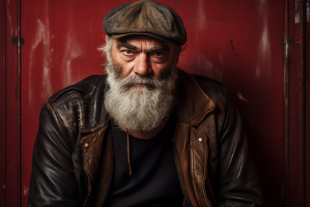 Portrait of an old man with a long white beard and a cap on a red background.